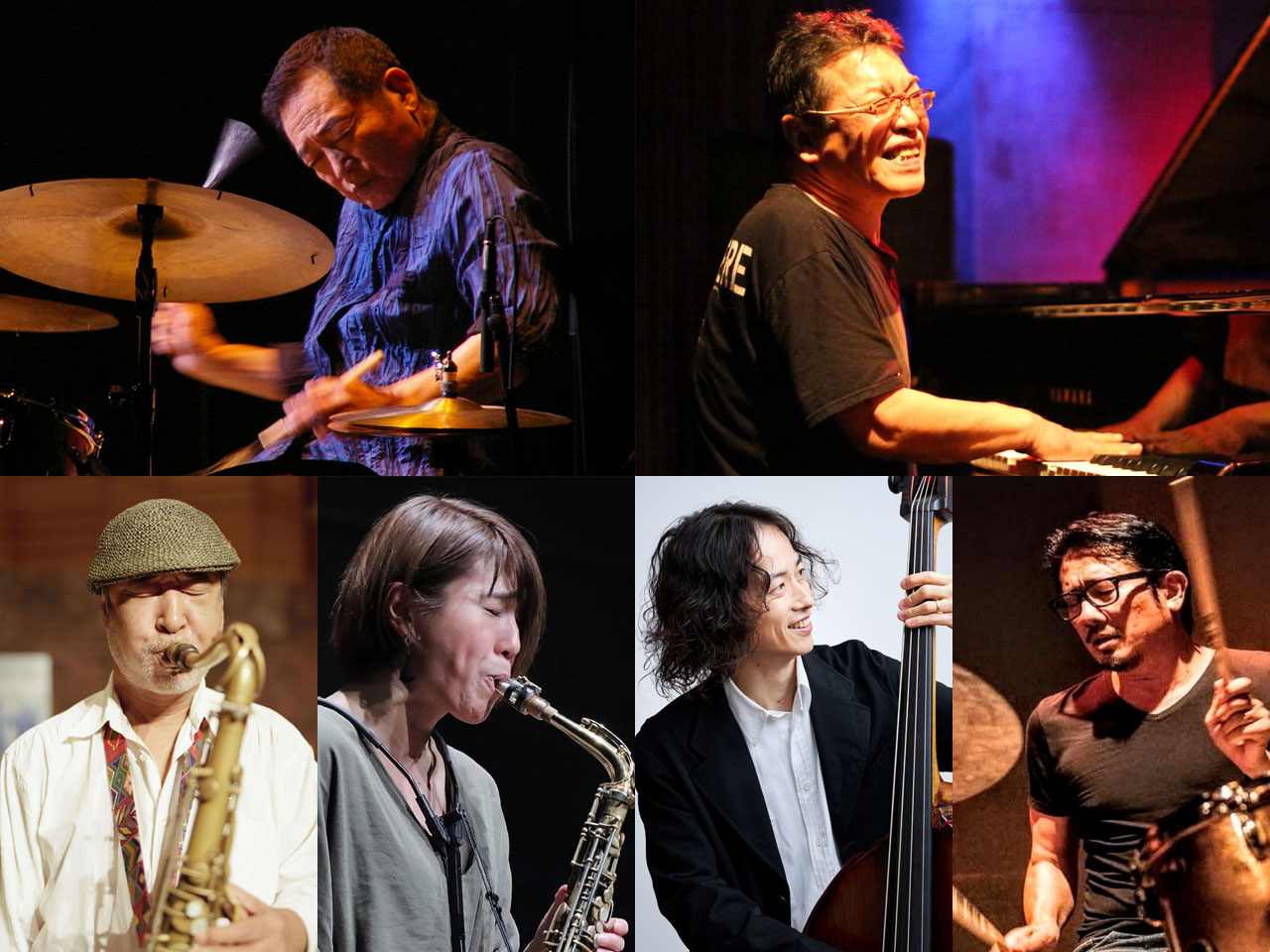 森山・板橋スペシャル 森山威男 Ds 板橋文夫 P 峰厚介 Ts 守谷美由貴 As 須川崇志 B 本田珠也 Ds 藤井康一+照本史+吾妻光良スペシャルセッション 藤井康一 Vo.Sax.ウクレレ 照本史 P 吾妻光良 G.Vo |